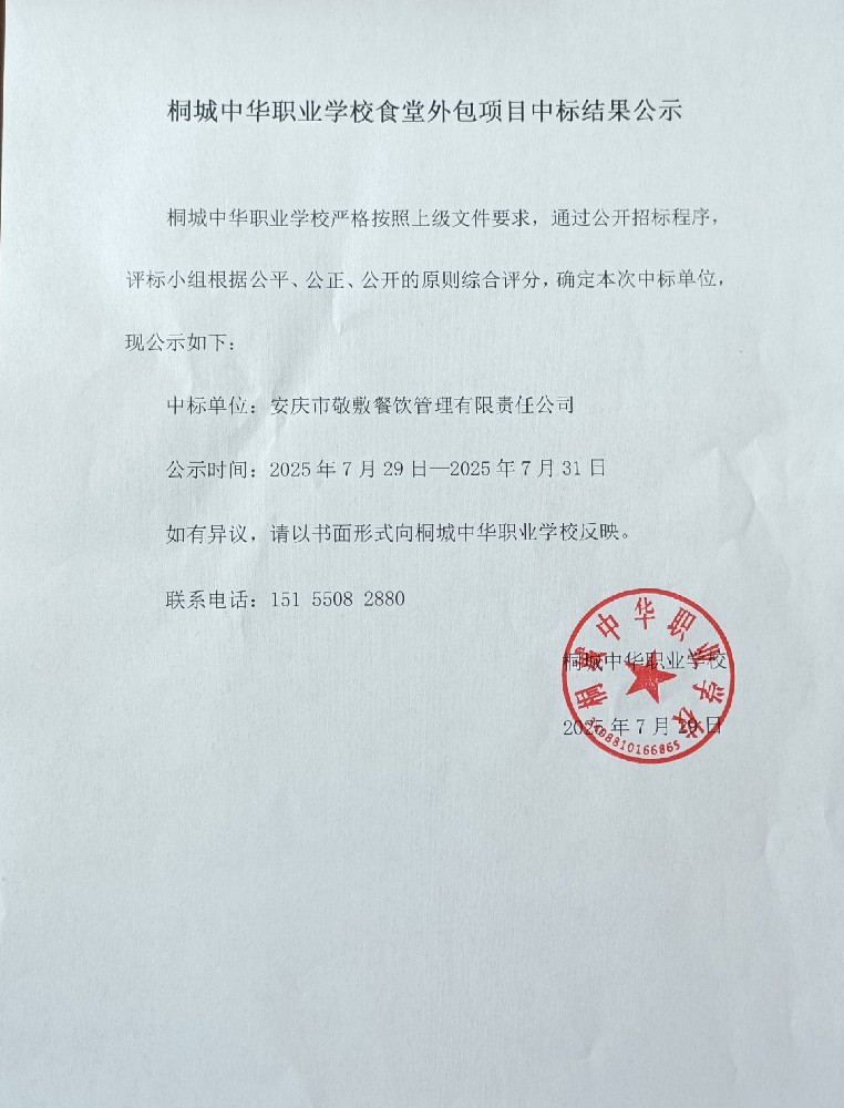 • 2025-07-29桐城中華職業學校食堂外包中標結果公示